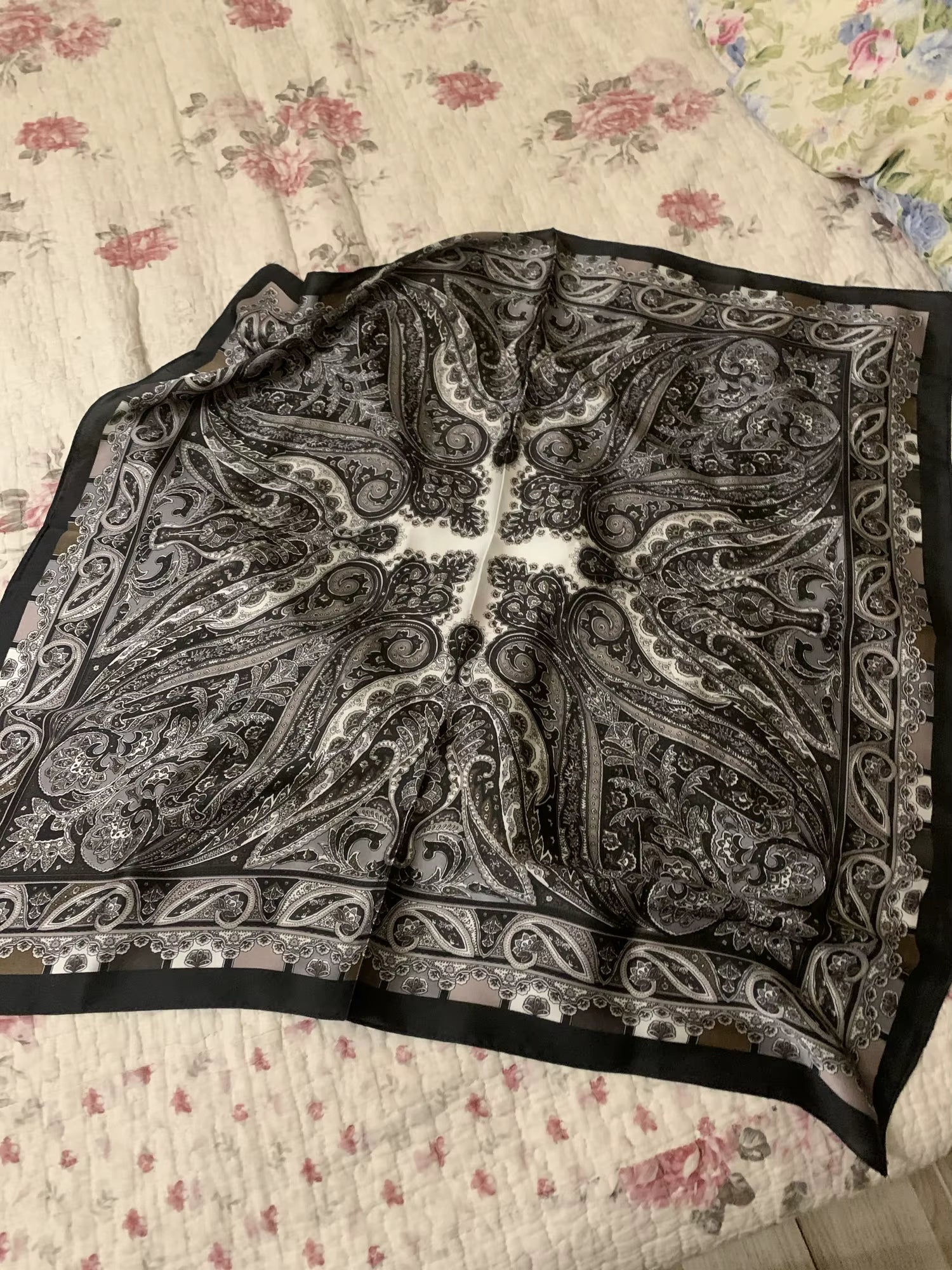 The scarf is simply gorgeous! The sheen of the fabric is delicate, and the pattern has a luxurious feel that enhances any look. I wore it in my hair and received compliments all day. I definitely want to order more!